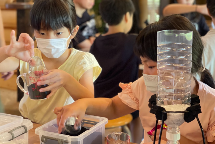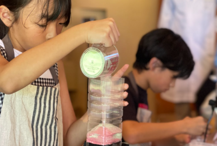 計量カップを手に、活性炭やカラフルな砂などを丁寧に測るお子さまたちの眼差しは真剣!