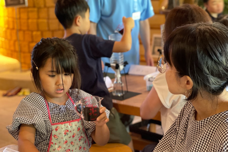 実験のあとは、水道水と浄水の飲み比べに挑戦!ハーブティーの香りの違いや、口にしたときの味の違いに、お子さまたちだけでなく保護者の方からも驚きの声が上がりました。