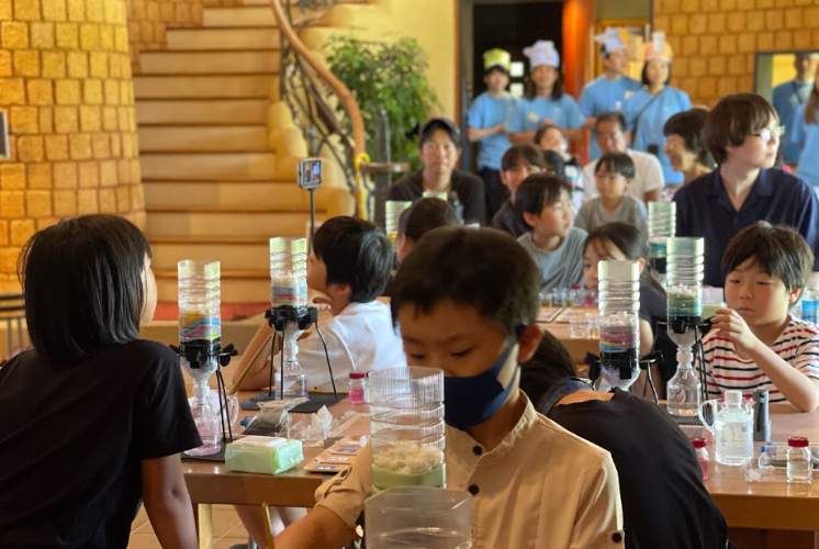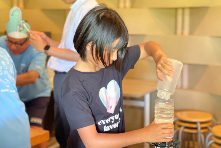 「さあ、今度はみんなで浄水器を作ってみよう!」という博士の声で実験がスタート!目の前には、石、小石、カラフルな砂、活性炭、セラミックがセットされたペットボトルのろ過装置がズラリ。計量カップを使って、みんな真剣な表情で材料を測っていきます。
