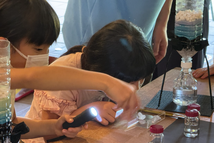続いては、ろ過の効果を確認する実験です。ろ過前のサビや塩素が含まれる水道水が入った小瓶とろ過した浄水の水を小瓶に入れ、ライトで照らして比較。お子さまたちが作った浄水器を通った水はサビの濁りが取れていて「全然違う!」と、またまた驚きの声が上がりました。