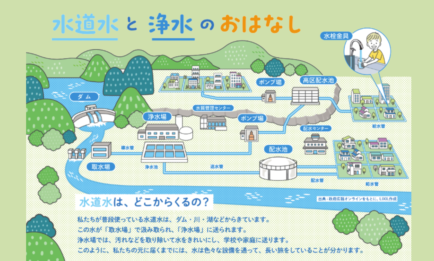 「みんなが毎日使っている水道水は、どこからやってくるんだろう?」