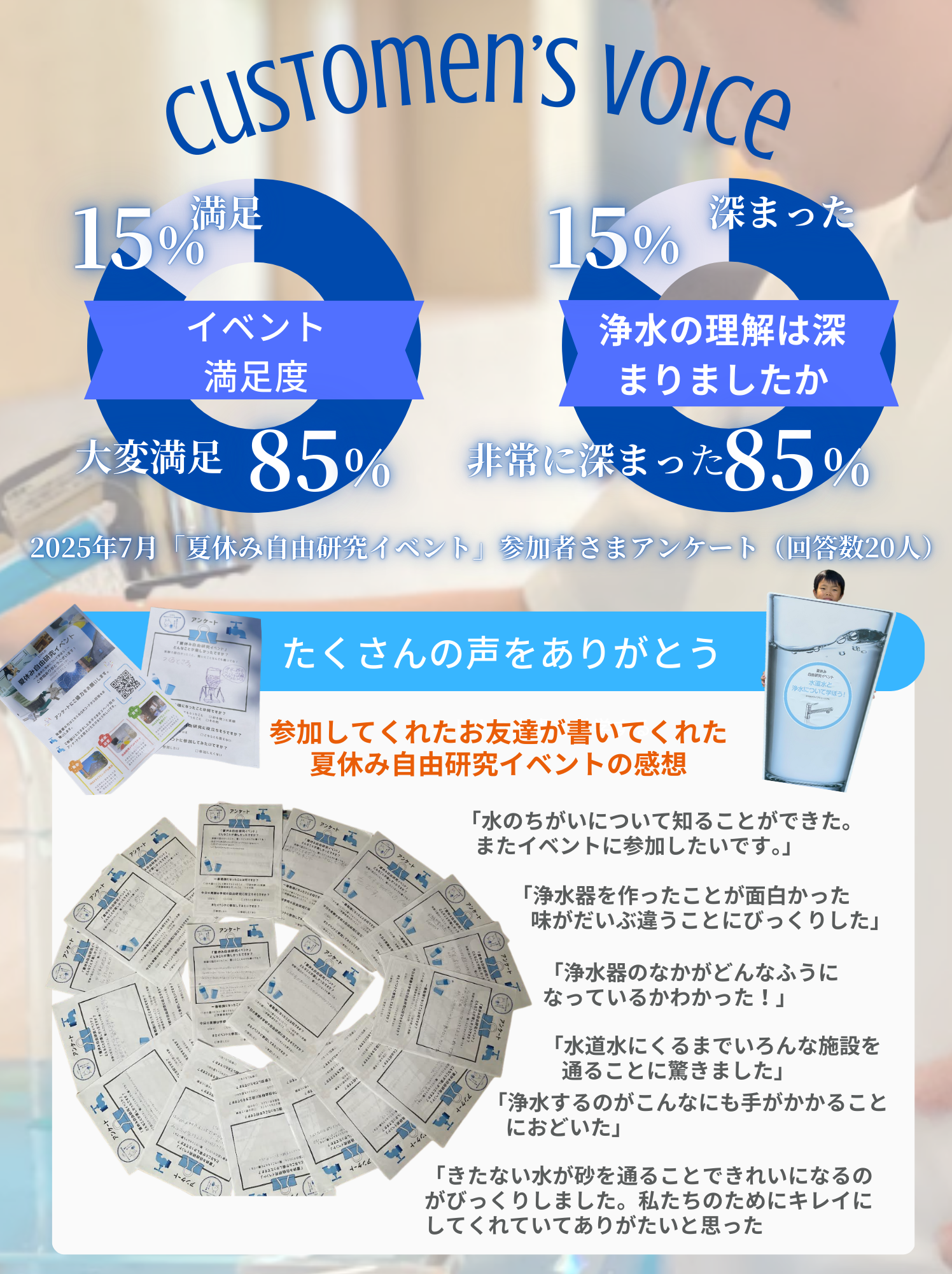 このイベントは、リクシルオーナーズクラブ運営の部門やINAXブランド浄水栓・浄水カートリッジに関わる部門のスタッフが、皆さまに「水」の不思議や大切さを楽しく学んでほしいという思いを込めて、心を一つにして準備を進めてまいりました。