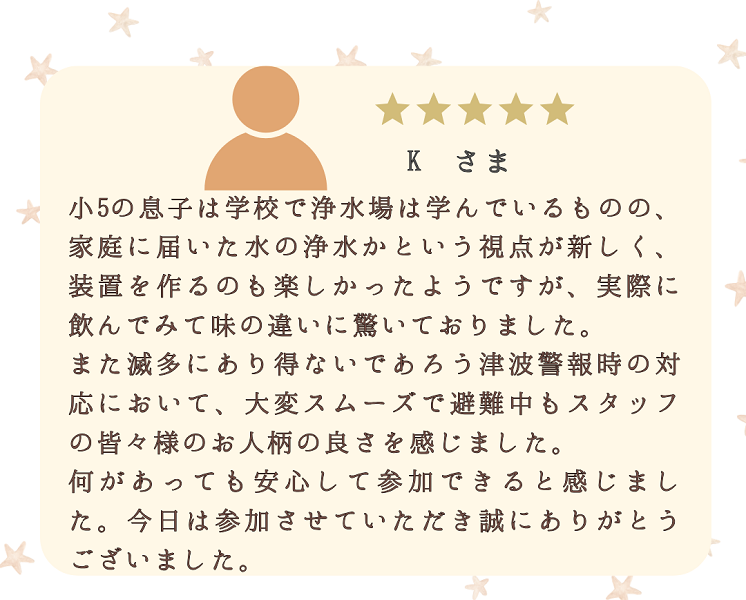 猛暑や津波警報という一幕もありましたが、最後まで笑顔で楽しんでくださった参加者の皆さまに心より感謝いたします。皆さまからいただいた温かいお声を紹介させていただきます。