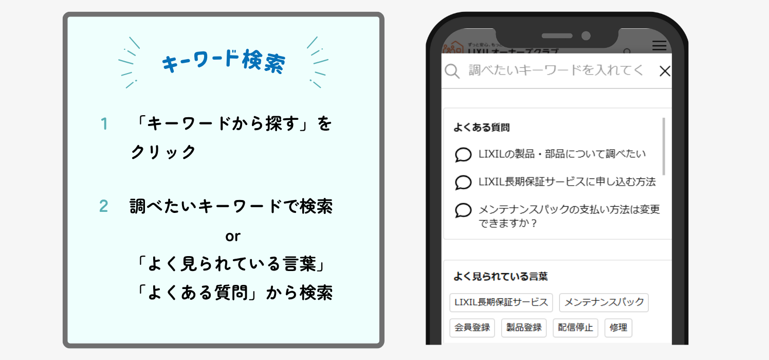 「キッチン お手入れ」「ドア 調整」など、調べたいキーワードを打ち込むだけで、自分の状況に合った解決方法を探すことができます。