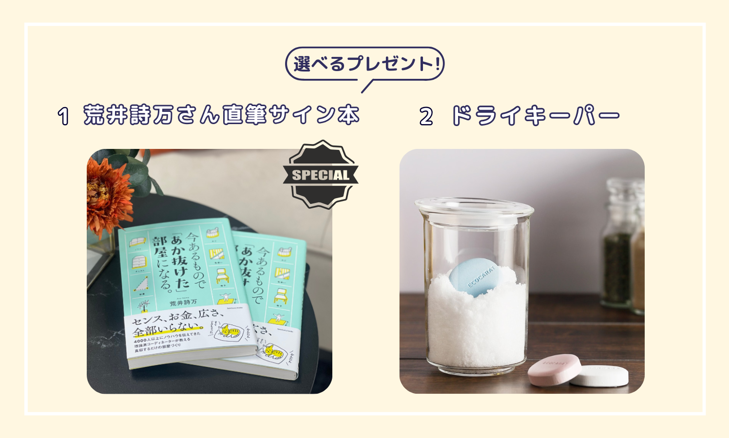 「荒井詩万さん直筆サイン本」と「エコカラットドライキーパー」からお好きなプレゼントをお選びいただけます。