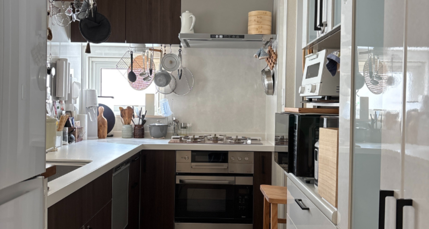 ステンレスのワークトップを人造大理石に変えたことで、キッチン全体が明るくなったのが嬉しいです。